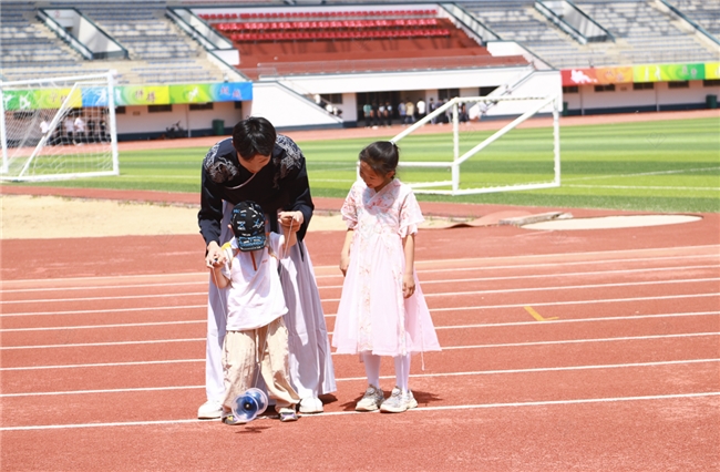 夏日的阳光洒在红色跑道上,绿茵场边的空竹嗡嗡作响。杨文哲身着带有传统纹样的服饰,动作舒展流畅,小小的蓝色空竹在他手中仿佛有了生命,时而在绳上高速旋转,时而被抛向空中又稳稳接住,时而在手臂间穿梭飞舞,清脆的声响引得在场的孩子们阵阵欢呼。他蹲下身,手把手纠正小朋友的握绳姿势,耐心讲解空竹的平衡技巧与发力要点,原本看似复杂的非遗技艺,在他的拆解与引导下变得亲切易懂。一旁穿着汉服的小女孩静静驻足观看,眼神里满是好奇与向往,不时跟着空竹的节奏轻轻晃动身体。